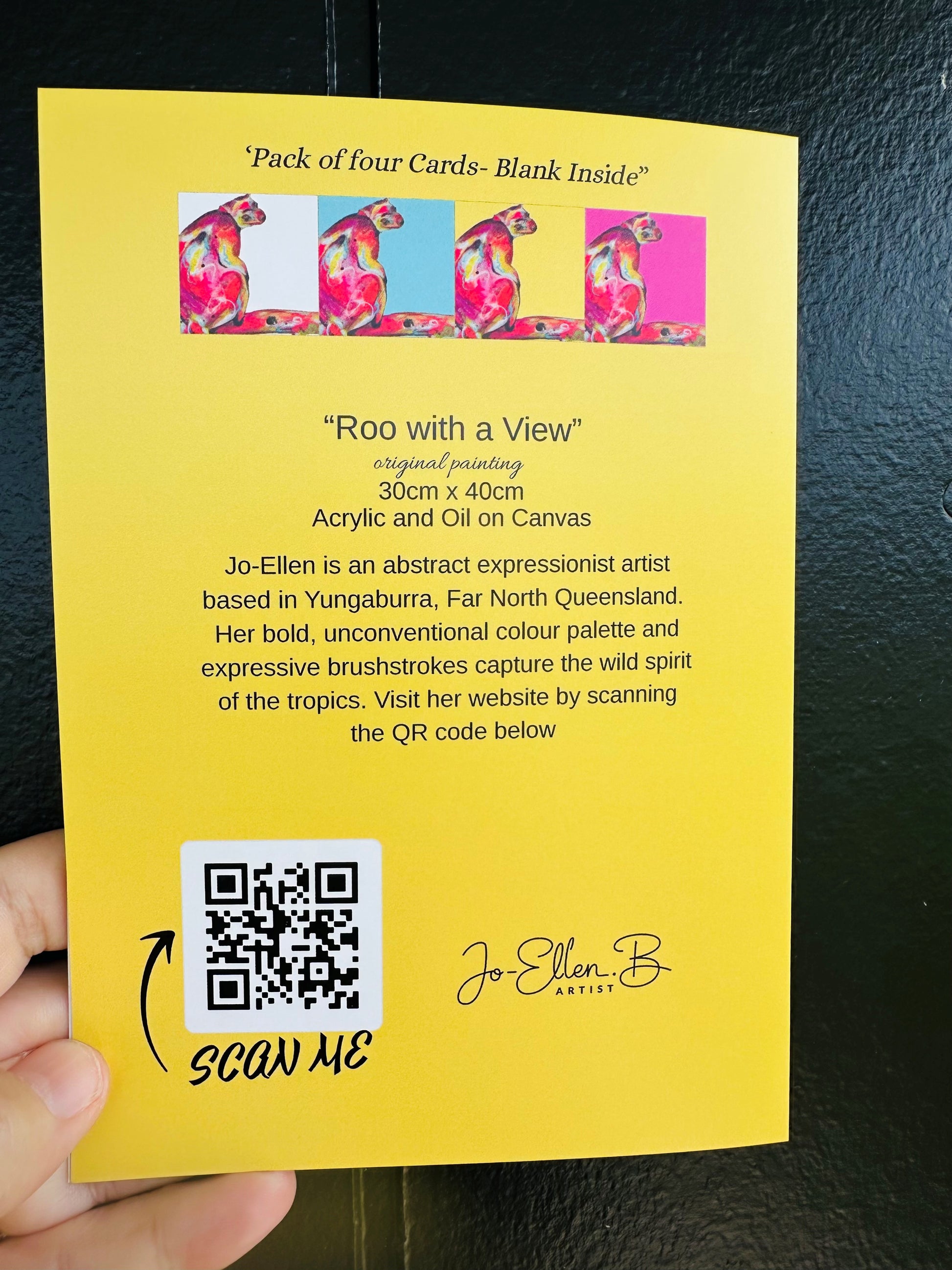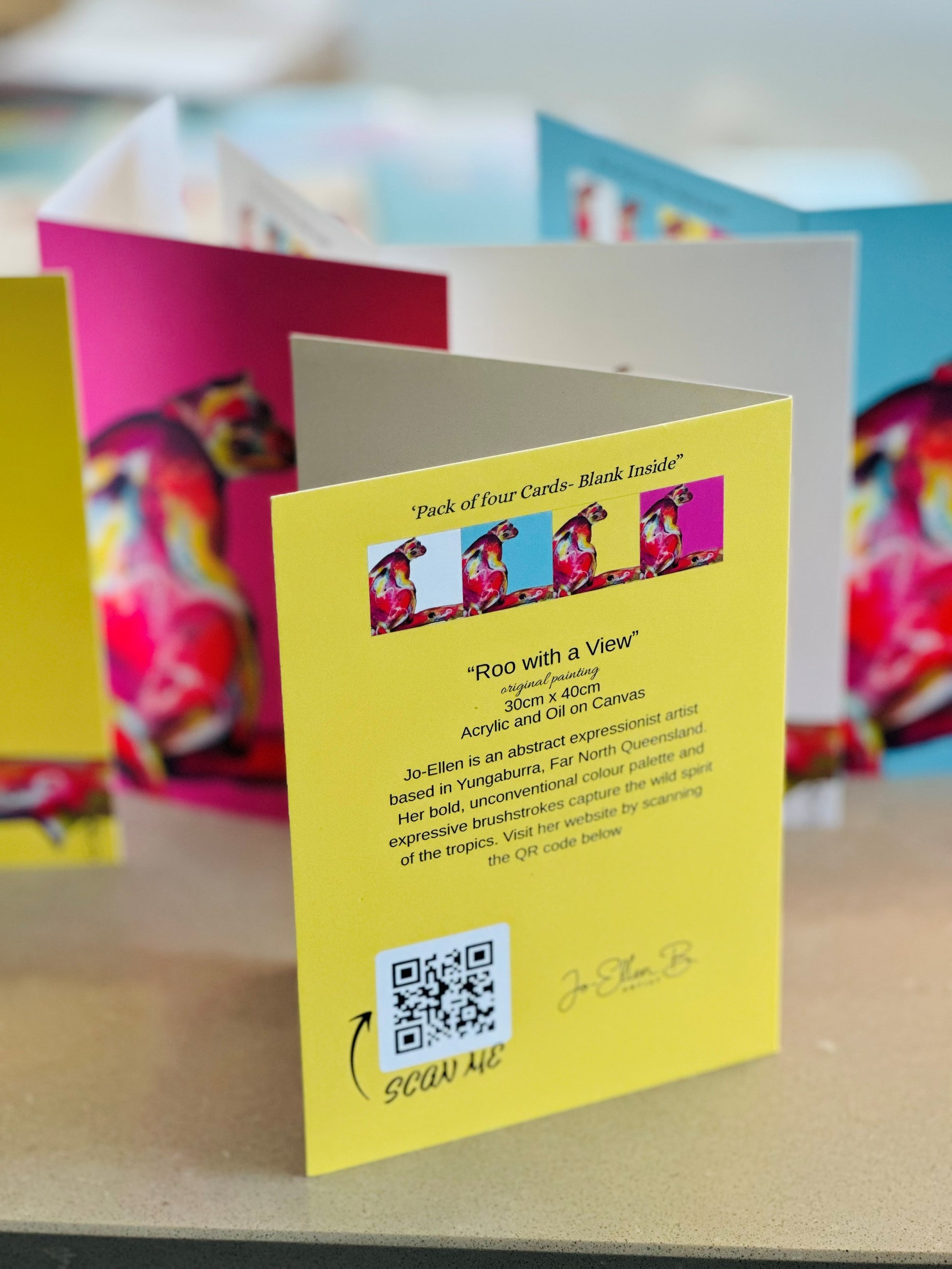 Each pack includes four beautiful printed blank inside cards inspired by the painting 'Roo with a view'.